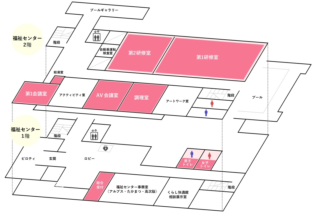 | 設備 | 会議用机15台、イス45脚、持運び用スクリーン、TVモニター、ワイヤレスマイク、BD/DVDデッキ、CDデッキ、ホワイトボード、案内板 |